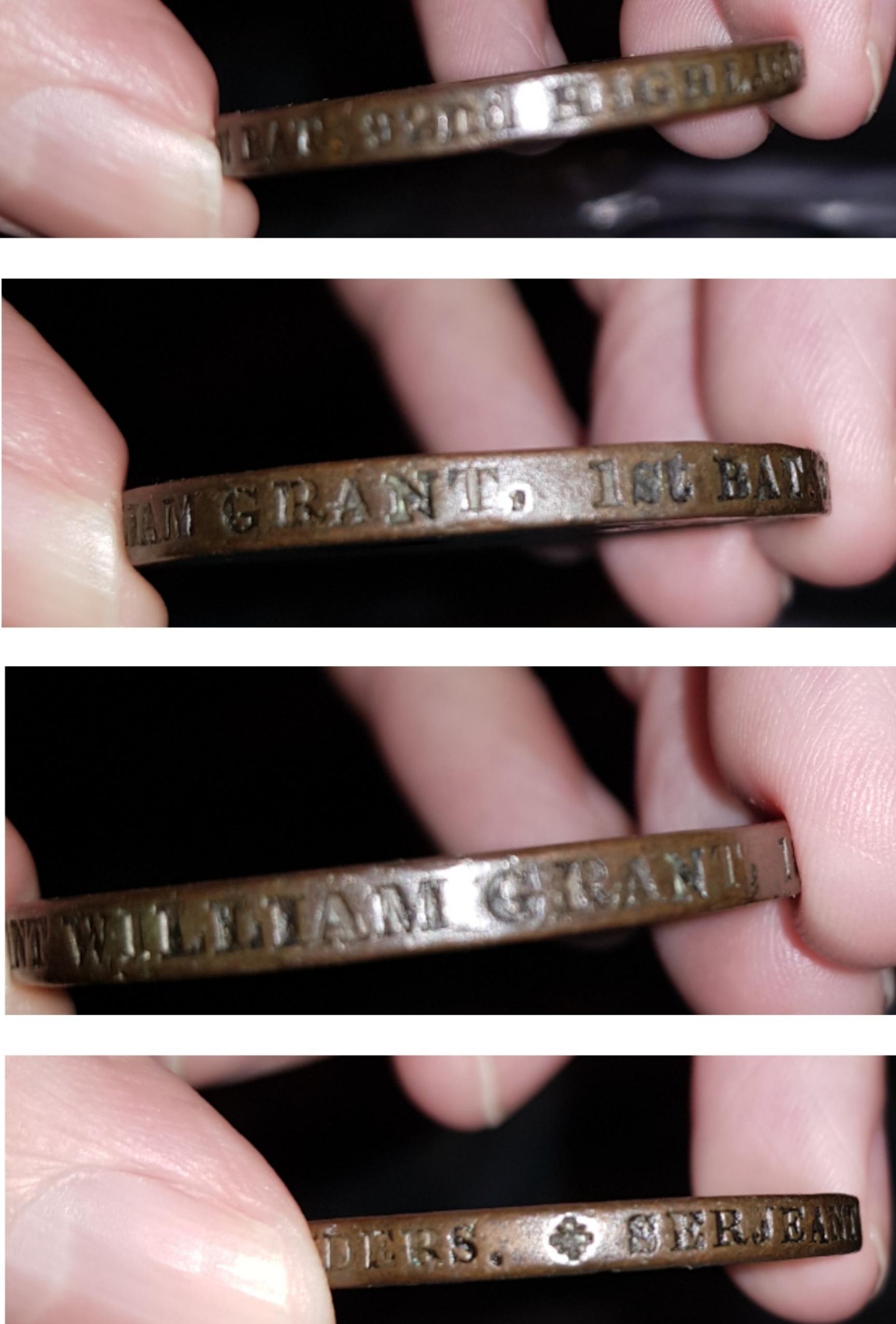 Not the best of pictures but here's the edge. It reads * SERJEANT WILLIAM GRANT , 1ST BAT 92ND HIGHLANDERS. I bought it online from a dealer in Glasgow who had omitted the edge details in the description of sale. I was a bit miffed at first until i did some research. He is Roll number 51 on the Waterloo medal database. He also composed a poem about the battle that was on a manuscript that was sold by Noonans in September 2006 (lot 1100)