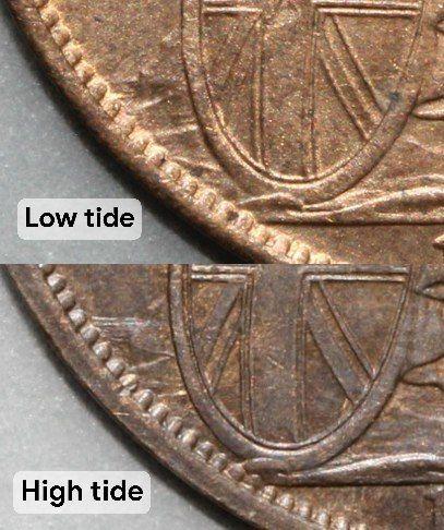 2. Here is what I plan to send to PCGS I believe this coin to be improperly attributed as High Tide/ High Sea Level https://www.pcgs.com/cert/56163554 Distinctive markers to determine variety correctly: Center of the upright part of P in Penny should point to gap between denticles, not to a tooth. Shield at bottom should basically be touching denticles, whereas there is a gap here in this coin. Tide on right side of coin should reach next fold up in Britannia's dress, closer to where legs cross. For comparison, this one is correctly identified: https://www.pcgs.com/cert/82915544 I can also provide more pictorial proof upon request.