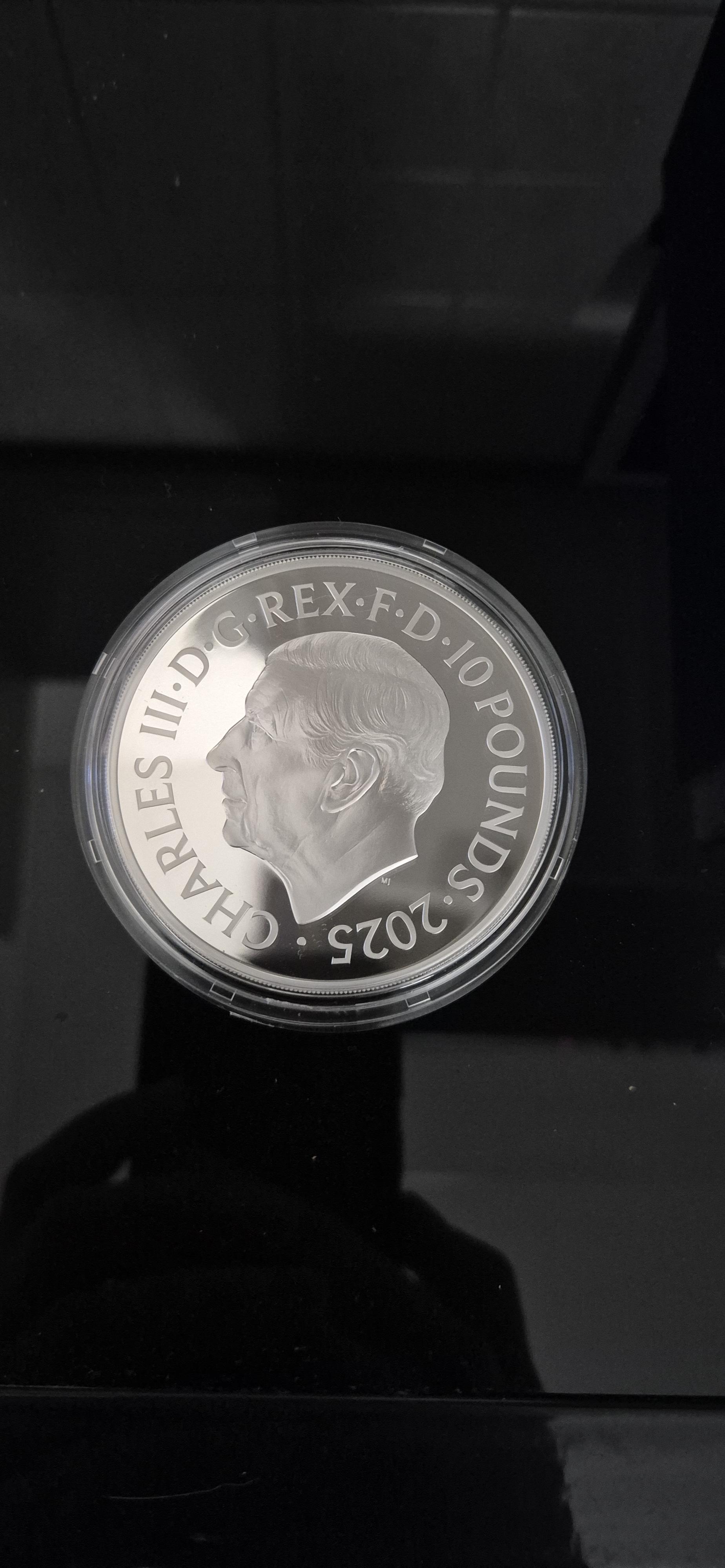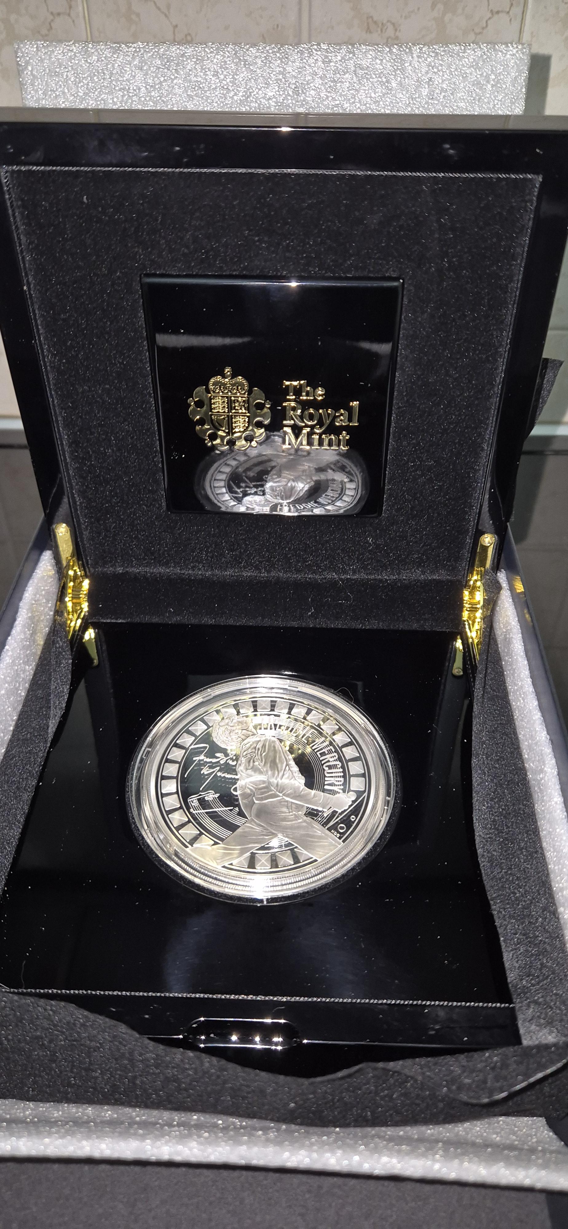 As there is no automated way of translating, I think you'd be better off posting in English Enzo. That appears to be a Freddie Mercury silver proof £5. One of the Royal Mint's 'Music Legends' series. It might even be the one they are currently peddling.