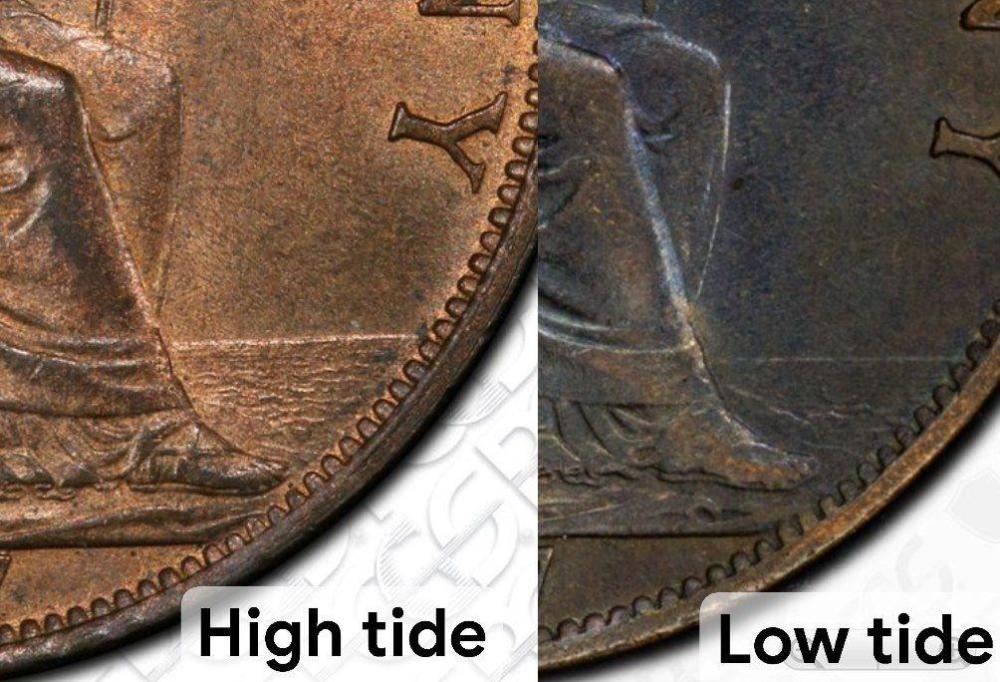 3. Here is what I plan to send to PCGS I believe this coin to be improperly attributed as High Tide/ High Sea Level https://www.pcgs.com/cert/56163554 Distinctive markers to determine variety correctly: Center of the upright part of P in Penny should point to gap between denticles, not to a tooth. Shield at bottom should basically be touching denticles, whereas there is a gap here in this coin. Tide on right side of coin should reach next fold up in Britannia's dress, closer to where legs cross. For comparison, this one is correctly identified: https://www.pcgs.com/cert/82915544 I can also provide more pictorial proof upon request.