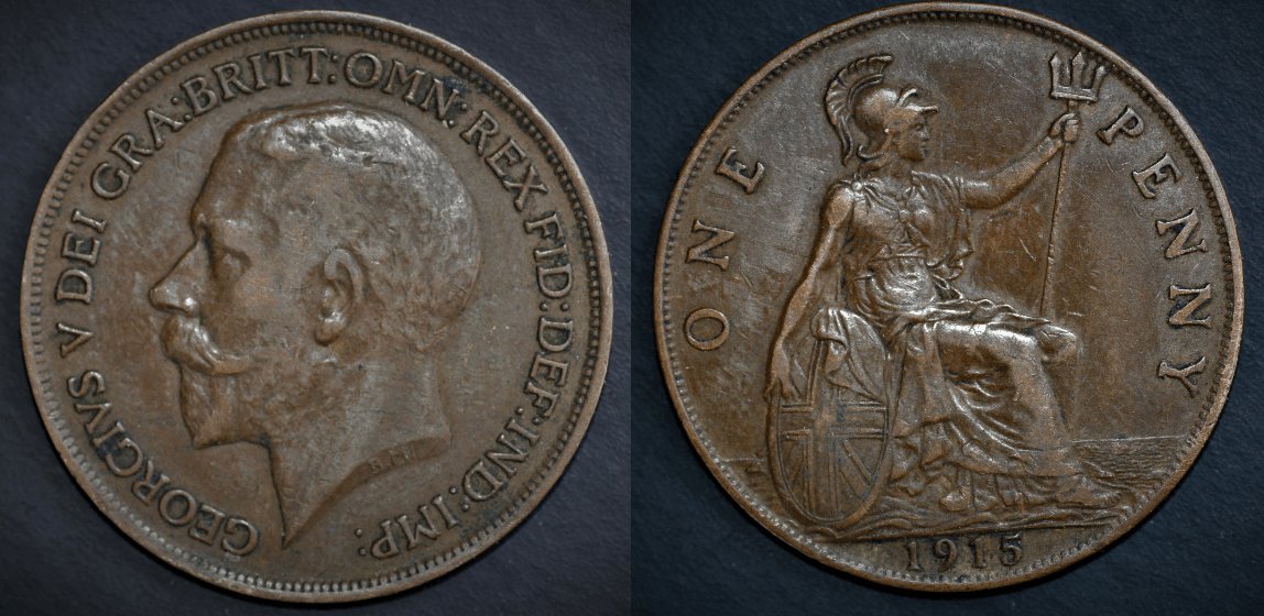 The following information is for the top coin surrounded in white background; George III, 1775 Halfpenny. First Issue-Tower mint, London. Tower Mint, London. Obverse: Laureate and cuirassed bust of King George III facing right. Legend: GEORGIVS· III· REX· (King George the third.) Reverse: Seated figure of Britannia facing left, trident in left hand, olive branch in right, shield with Union flag resting on left, legend around, date in exergue. Reverse: BRITAN NIA 1775. Catalogue: Spink# 3773, KM# 601. Copper, 10g (actual worn weight 9.02), 29mm, edge plain.