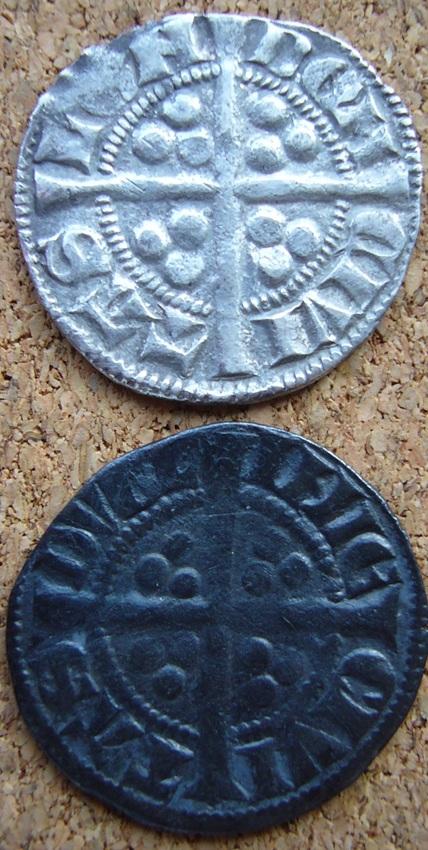 The obverse is a bit clearer now. I can see the eyes of a crude portrait and maybe a crown, but that's about it. 17mm is definitelty on the small side for a typical English short cross (which it obviously isn't), long cross or Edward Penny, but as I said I don't think it's English anyway. Maybe it's a continental sterling imitation, but I can't find any that look like that. The fact is I really don't know.1 point