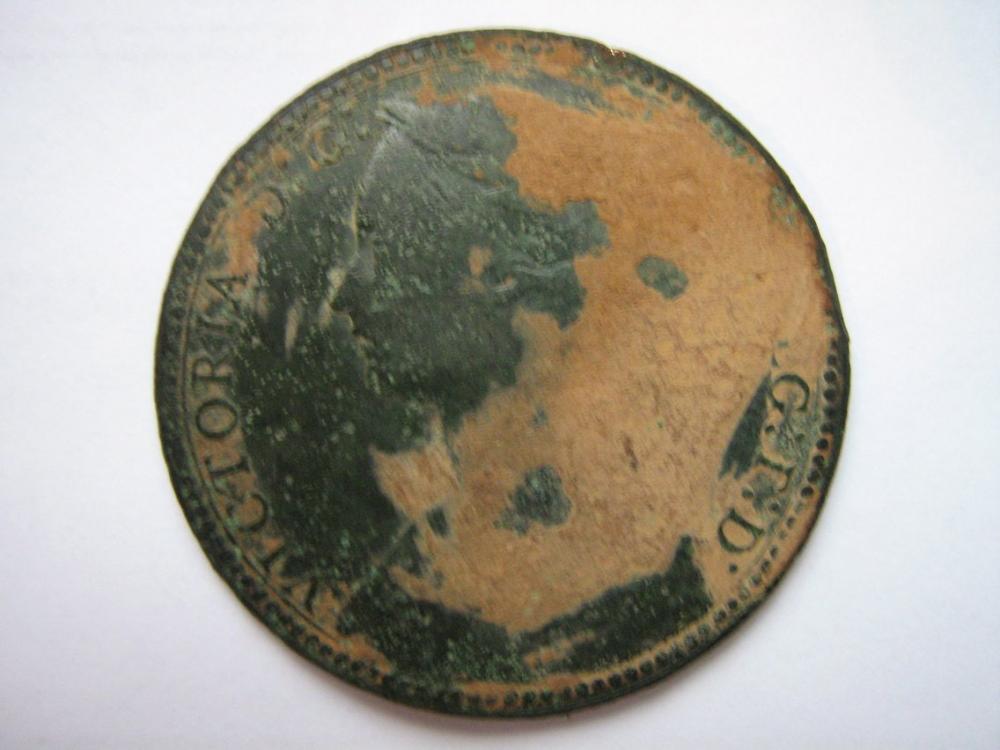 Hi, I'm looking for advice on cleaning this coin. I found it a couple of years ago in a paddock in Victoria Australia, covered in dirt. I took it home to Melbourne and soaked it in a glass of water and scrubbed it with a toothbrush, getting enough dirt off to read VICTORIA and see it wasn't in very good condition. Since the rest of the dirt wasn't coming off easily, I put it in a drawer and forgot it.
