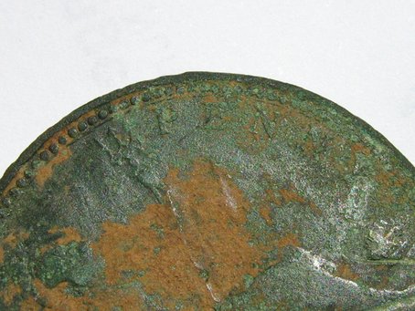 Looking at the coin, the way the dirt came away from the edges suggests its a beaded edge. I'd like to work out what variety the coin is, but first I need to get the dirt off properly. It's very fine dirt (silt?) and seems almost baked on. Any advice would be appreciated.