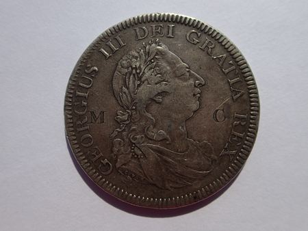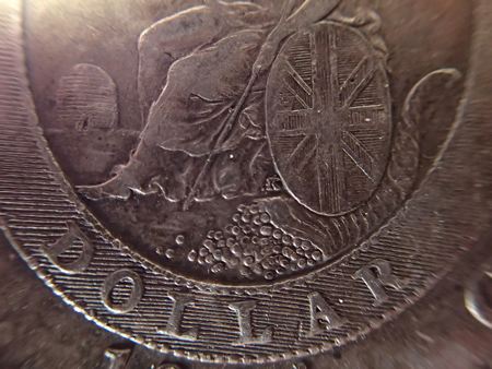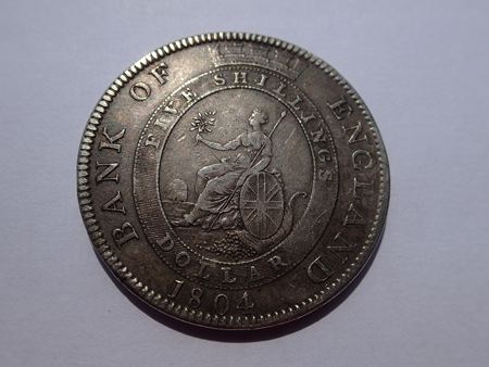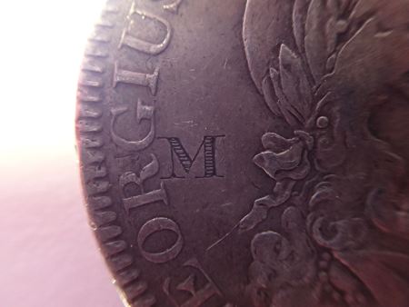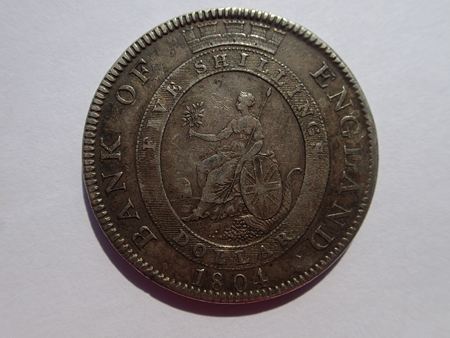 4. Hello, looking for a bit of guidance, knowing nothing about coins Clearing out an old desk, found what seems to be a George III 1804 dollar. It looks like all the examples googled, is a bit worn, but, unlike all the photos I've seen, it has "M C" stamped on the side with king's head. M one side of the head, C the other. The letters are ridged in the same way as the band that says "five shillings" is on the other side. Might it be real? thanks for any thoughts