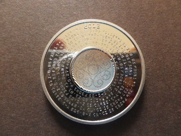 I would welcome any thoughts or suggestions on what this might be, £5 coin size and weight, plain edge. I emailed the RM but they wasn't very helpful and just said it's out of a proof set. The spiral of letters and numbers appear to have been engraved prior to striking