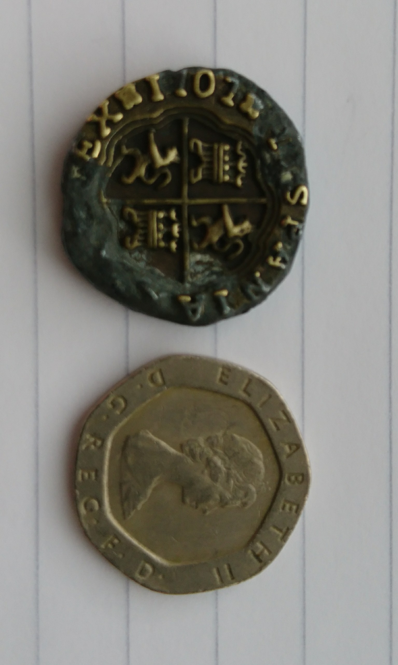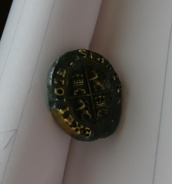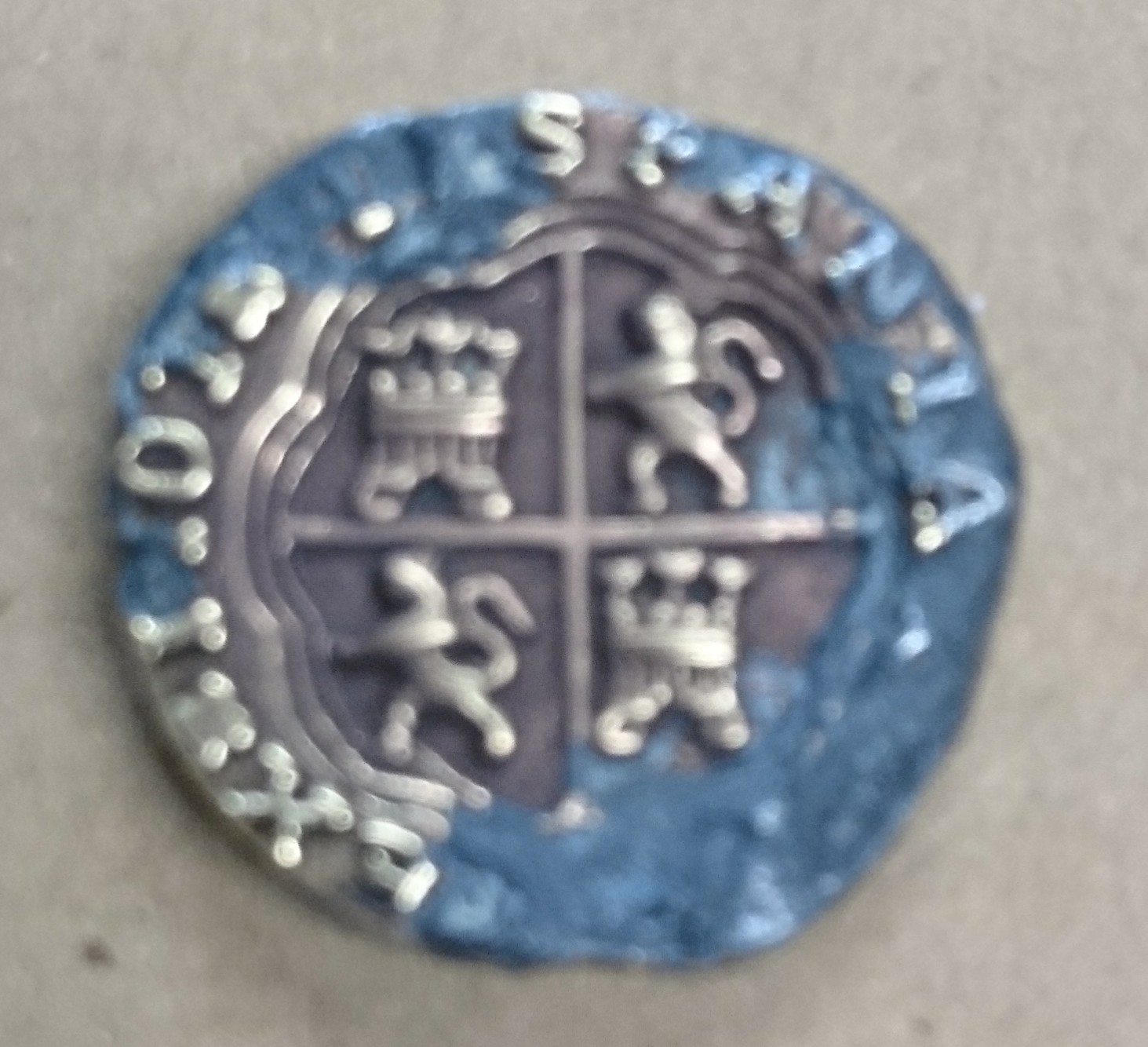 " coin" and the symbols are spanish i have researched a little online but see similar but all with different symbol on reverse side it is very light ,whitch makes me think its plated alloy of some sort token coin old forgery ?not sure