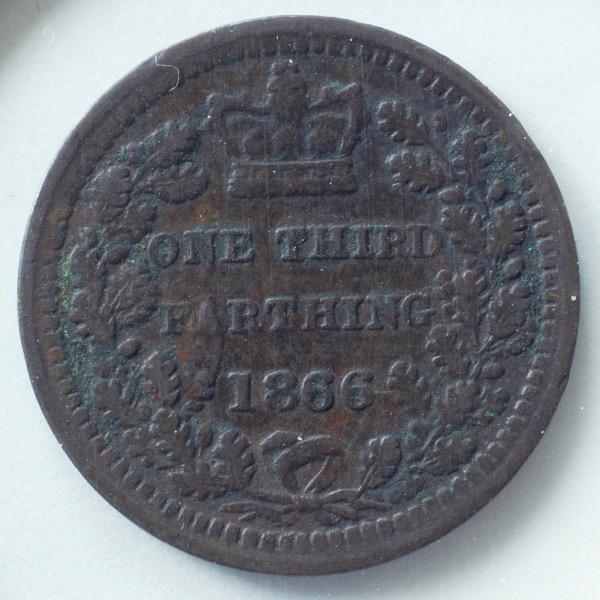 This 1866 Third Farthing seems to have a mis-strike(?) with an oval shape by the A in farthing. Is this of any interest?