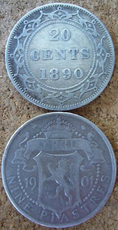 way back in the pre computer days these coins were dismissed by collectors / hoarders alike,...... I was told to hang on to them as they still had a silver content, these as they turned were stashed and forgotten about ... I seem to think they cost pence whilst sorting out I have discovered x 2 of interest...possibly rarity's ??? Victorian 1820, Canadian Provenances 20 Cents Newfoundland Victorian 1901, Cyprus, 9 Piastres, (minted for 1 year only) ............π