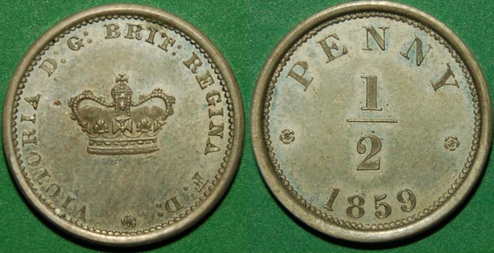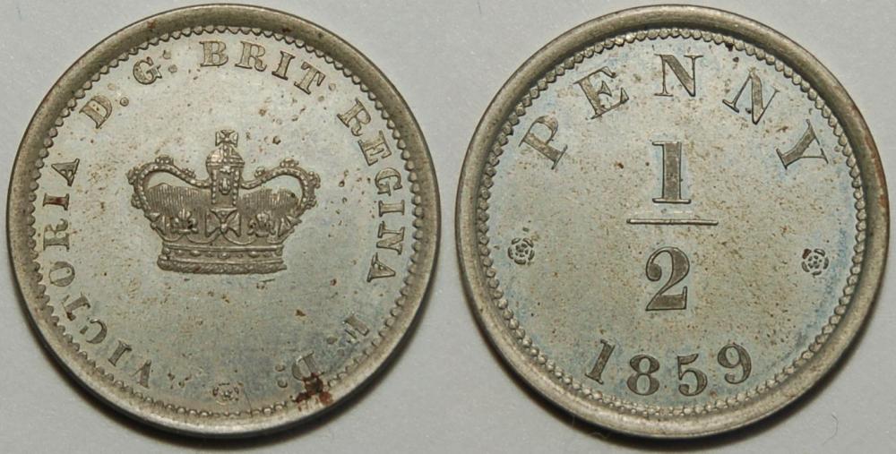 The halfpenny is interesting as the reverse die is heavily flawed, presumably to the point of destruction. The illustration in Peck shows no sign of the flaw on this die. Also useful is the chronology you can establish regarding the various pairings. The obverse die is paired with the P2036 & 2037 reverses. Using my P2037 and now disposed of P2036, it is possible to say that the dotted edge P2037 came first because the F at 4 o'clock is intact, whereas on the Plain Edge P2036 it is partly filled as is the case on the museum example. The implication is that they changed dies before varying the collar used. Always good to learn something every day