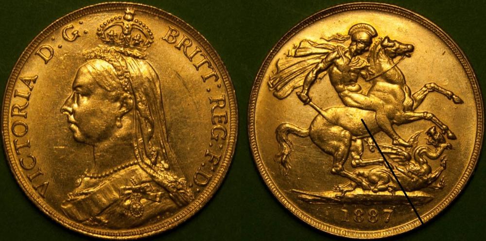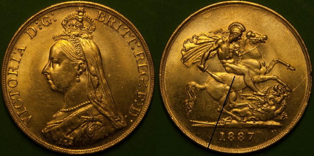 1908 Half Sovereign QueryRob replied to Bernie's topic in British Coin Related Discussions & Enquiries The 1960s forgeries were assessed as being 89% gold. However, there are a few pointers which scream dodgy. In the case of the £5 1887, they are about 0.1-0.15g light. The number of milling lines is also wrong at 188, compared to the Royal Mint's 184. The detail is somewhat mushy, and the BP in the exergue is wrong. The die axis is also slightly out, being about 10-15 degrees acw or at least it is in the case of my examples. Attached is a £5 Beirut.