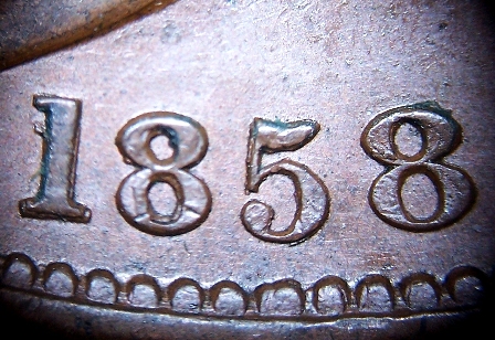 Hi Bob, Hi John Thank you very much and sorry for my late answer. Amazing that Bob owns exactely this "variety". Thanks for the great pictures. I had a look at Michael Goubys website (should have done before posting) and indeed this variety is listed under the name: "CP 1858 Ha". John, your explanation for the lots over recuts/overstrikes in the year 1858 is very interesting. But using old dies to finish that year instead of creating expensive new ones would mean, that the decision to change from Copper to Bronze has already been made at that time, wouldn't it? Or did I misunderstand you? Only a few thousand of 1858 Pennies had to been made at the end of the year, so old dies have been used to finish this year of mintage. Something like that? Of course I at once had a look at my 1858 Pennies to find the "Large Rose" and of course I didn't find one S.y.s. Holger