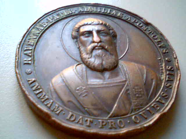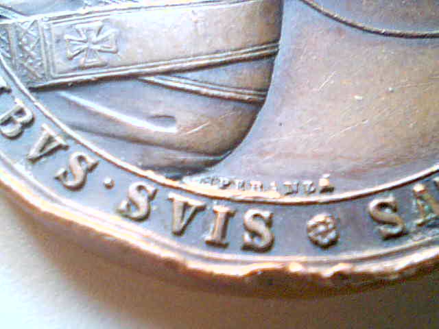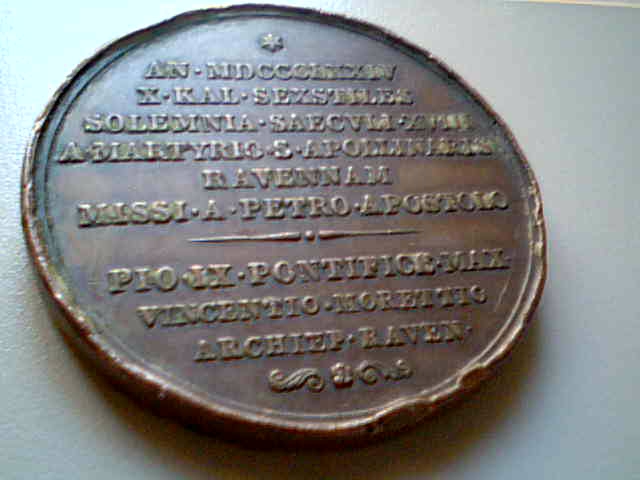 Hi here's another one bought in a lot of mixed UK coinage I think this is some kind of religious medallion. The name of the maker is Sparenza and there is something on the net about him but I cannot find this one. I cannot read Latin?? but maybe someone can help the date is 1874 I am posting pics along three posts. Writing side says: AN MDCCCLXXIV X KAL SEXSTILES SOLEMNIA SAECVLI XVIII A MARTYRIO S APOLLINARUS RAVENNAM MISSI A PETRO APOSTOLO PIO IX PONTIFICE MAX VINCENTIO MORETTIO ARCHIEP RAVEN What do I have here? I guess as it was in a mixed lot and not perfect condition it's not worth much but Sparenza seems to be a maker of fine medals Thanks Russ777