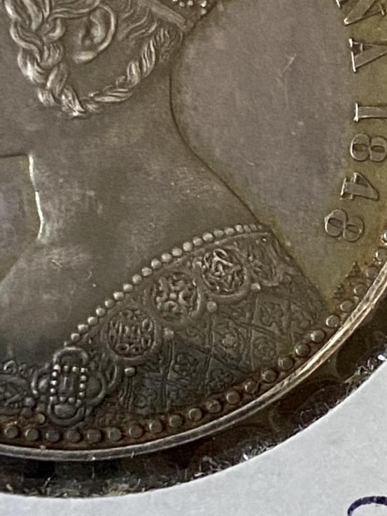 But what is your opinion on the beading and the designs at the edge of the gown? My issue with the neck is that there appear to be some deeper "gouges" that then appear to have the parallel lines of ?abrasion OVER the surface of them. Rob is my man, but this is a coin that I would have to hold on. Will check my own 1852s.... -