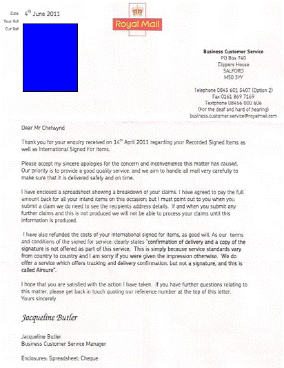 I started a topic on Royal Mail a few months ago regarding the whopping amount of failures in collecting signatures from my recipients. I claimed for 94 Recorded Delivery and quite a few International Signed For. After a very technical letter highlighting their T&Cs they have awarded me the full refund of £180.06 I was claiming for! They did point out though that they have awarded the International Signed For deliveries as a gesture of good will, they had to refund with the Recorded Delivery ones or they would have breached their contract. A total of 16% of my 2010-2011 Recorded Deliveries were performed without collecting a signature, at the current rate of 77p per time it soon adds up. I hope this will now inspire some of you heavy RM users to check through all your receipts and cross check the T&T service and submit a claim, it did take me all day to do it with over 800 receipts but obviously worth it for £180.06!
