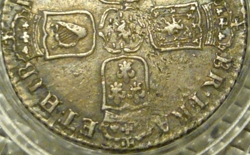 hi everyone just added this shilling to my collection, as usual taking a photo and on looking at the reverse of the coin it has the usual inscription BR.FRA then ET.HIB but the H has some extra pieces that resemble an E i have added a photo of the bottom half ive had a little look but am unable to find any information is it just another broken die? any comments appreciated thanks