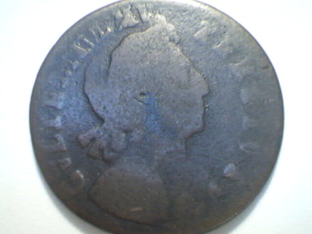A while ago, I inquired about the value of two 1699 halfpennies, type t2d, that have no stop after the date. I was disappointed to hear that they are worth about the same as the type with the stop (even though on a site by Tony Clayton the t2d in FINE condition is listed at 5 times the value of the one with the stop). I recently acquired another 1699 halfpenny without the stop, but this one also has no crossbars in the A's. Again from Tony Clayton's site, there is a listing for no crossbar A's, 1699b, but it appears by the placing of this listing, that it is for the type that has the date in the exergue. Is this right, or does it refer to the one with the date after Britannia ? Is there a designated number for a 1699, no stop, no crossbars, or is this combination unknown ? Yes, it has corrosion damage. I'm going to run out of kb's for photos, so I'll make a second post about the stop.