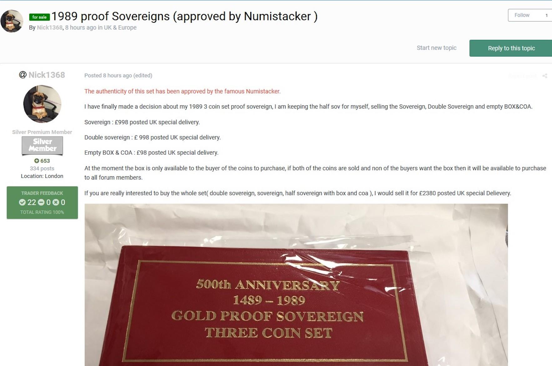 19. The only real want in the sets is the Sov, a graded 70 are selling up to £1k and more, personally i'd buy the set, get the sovereign graded and punt it and keep the 2 and 1/2 as cheap gold. The other forum where king dick resides is called thesilverforum