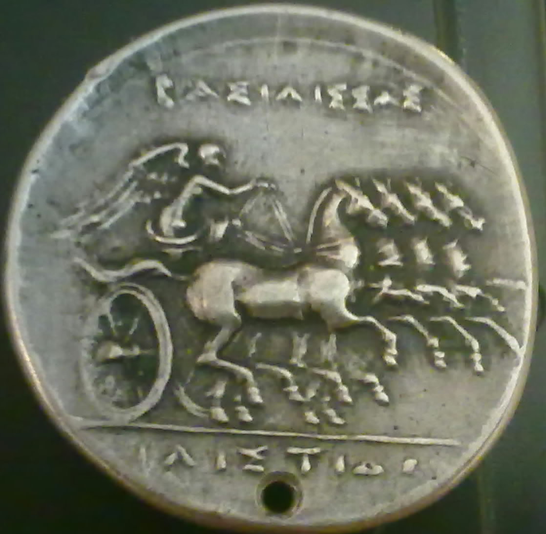 18. Hi Peck, thank you very much for the info, I have now found out most of the info. I googled kasilissas and it suggested basilissas which then put me in the right direction. it is a Greek Sicily, Syracuse, Queen Philistis 16 Litrae. Diademed, veiled head left/ BASILISSAS FILISTIDOS, Nike driving quadriga right. Philistis was the wife of Hieron II 274-216 BC. The only info I havent found is the H on obv but I will continue to search about.