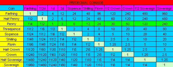 I'm going to trump that! I made this a while ago but I think it's pretty accurate. For example at the top there is one farthing in a farthing (obviously) two in a halfpenny, four in a penny etc!