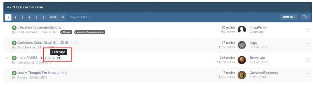 When you're looking at the unread posts by using the unread content button, it's not possible to do it because of some sort of glitch/coding error by the providers who built the forum (there are workarounds I was looking at but I don't fully understand them, I need to do a bit more digging). It's also not possible to look at the 'last unread post' for the same reason, which is a major pain. However if you are browsing the forums in general, you can go to the last page by clicking on whatever number is last (attached), but still not the last unread post