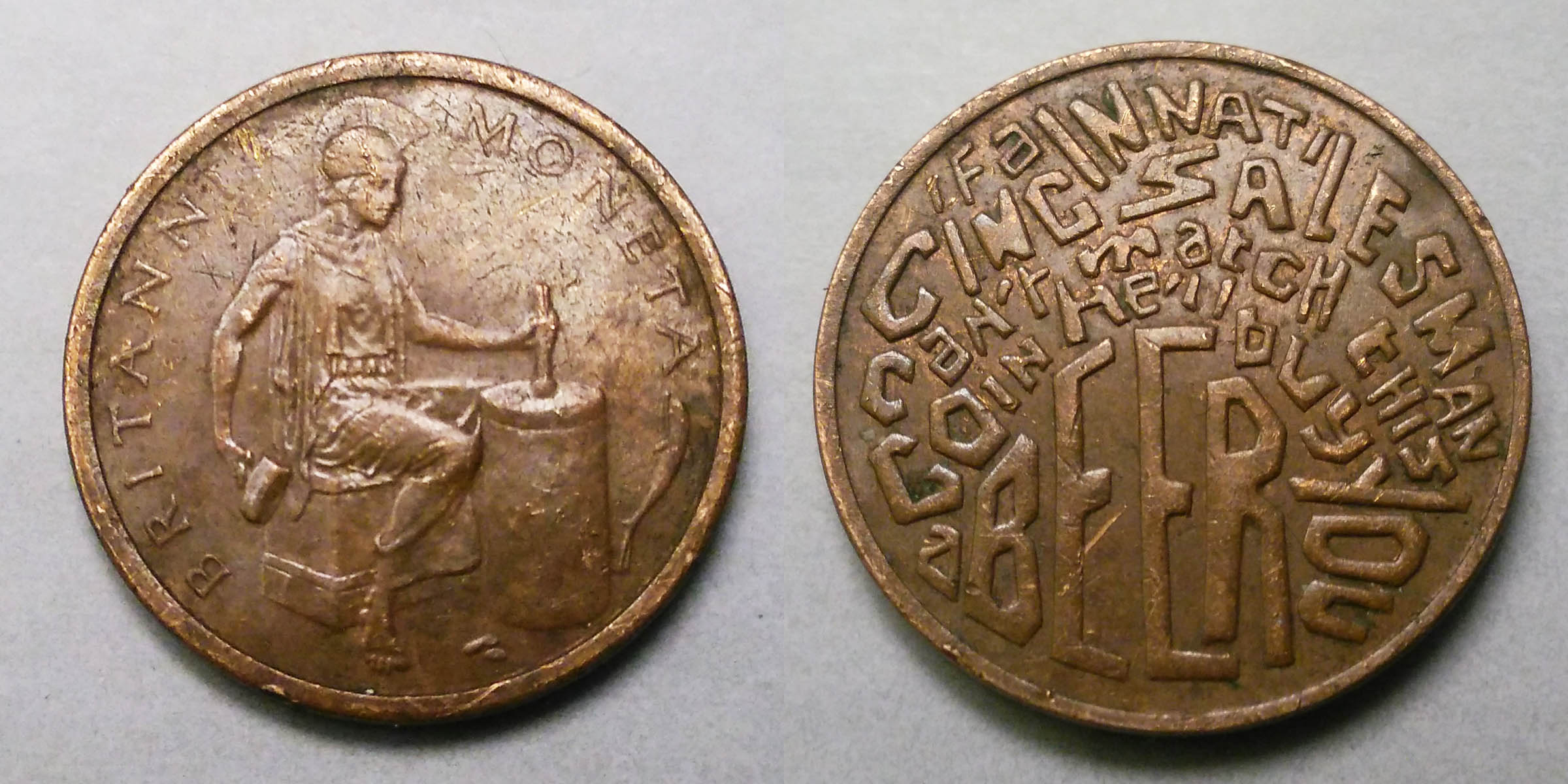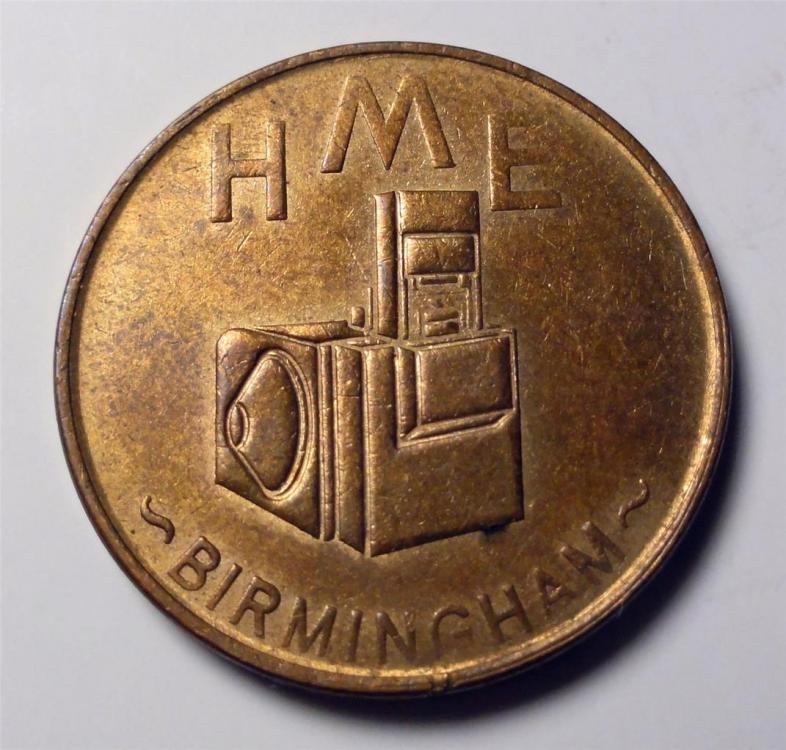 Hi All Just came across an unusual token. HME Birmingham produced a coin in the late 1950-60's with Obv: "HME Birmingham" with a coin press in centre. the Rev: with the phrase "If a Cincinnati Salesman can't match this coin he'll buy you a beer". My question is have any of you seen the same coin with the Britania Moneta obverse? It has definitely seen better days but found in a bag load of predominately machine tokens.