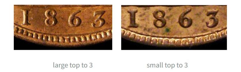 Think it is an "actual" 7 over 7 (lower 7 type) and therefore example 12, rather than 3A of the higher 7 type, Richard @secret santa @The BeeBee - my thoughts on your other coins: the 1860 is typical of what happens when a coin is buried in soil for ages (ie. a detector find) and acids in the soil eat away at, ironically, the more raised parts of the design leaving this "ghost" image of letters and numerals. Have seen it myself on numerous coins, silver included, so of no numismatic interest, sadly. The 8 double entered on the 1893 is a sign of die strengthening/repair/re-entry as happened a lot in the Victorian series as dies often got a real pounding. All sorts of dates display various letters and numbers thus doubled. If you do track down a copy of Gouby's latest penny book with the update pages (good luck!), he covers quite a few examples, but loads of others are known. The less obvious the doubling, generally the less interest there is - compare the significant doubling of your 1874 above! The 1863 halfpenny looks like a standard large 3 (see below - from Richard's halfpenny website, parallel to his penny one) to me. I think on your example, some wear or scuffing diagonally across the 3 from top right to bottom left has deformed the 3 slightly? Again, I don't think it is of any significance. -
