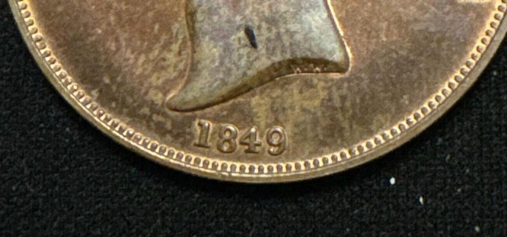 The date digits are not quite in the correct font. Here's a close up of another COPY 1849 in un-doctored condition. The digits are just not "quite right" - hard to explain, but clear if compared to a genuine specimen. Also, I've noticed the small WW on the truncation are also the wrong font (and a bit too big).