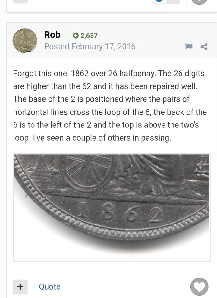 mrbadexample Posted October 18, 2022 Author Posted October 18, 2022 22 hours ago, Zo Arms said: Whilst we're here, does anyone have an F289, 62 over 26. Mentioned in the 2016 Freeman and recognised by Dracott in his 2021 update. I think I've found an example and a little piccy to show what I think I see. Would like to see a closer / better photo. Do you have it in hand yet? Quote