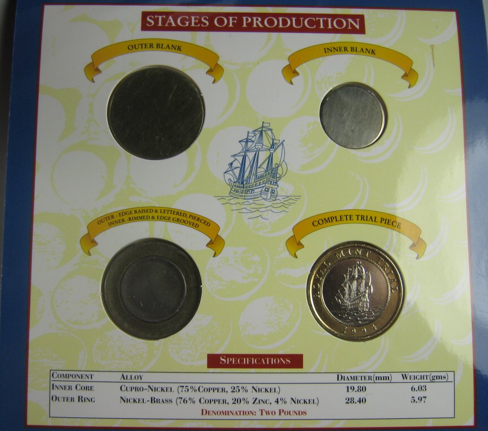 1949threepence Posted July 17, 2010 Posted July 17, 2010 I'd quite like one, but not at that priceYou do get 4 pieces in there, so it isn't as bad as might first appear.Does anyone know how many were made and who the designer was?Well I've tried to find out, but drawn a total blank. There is one report from the Royal Mint itself, which refers to the initial test design in 1994, but gives no designer name. The only names we are given are those of Rushin & Maklouf for the reverse and obverse of the eventual circulation issues in 1997, and Rank-Broadley for the 1998 obverse. The link is hereUnfortunately all the other links on the issue, appear to have cloned the Royal Mint report to some degree or other, so the name of the trial coins designer is unknown. Maybe a Royal Mint employee.Hopefully somebody will have access to this obscure information.Can't find my set at the moment but I have an image of the four stagesWell I tell you what, put "TWO POUNDS" in place of "ROYAL MINT TRIAL", and that wouldn't have been a bad design for the coin. Looks concise, neat and attractive. Quote