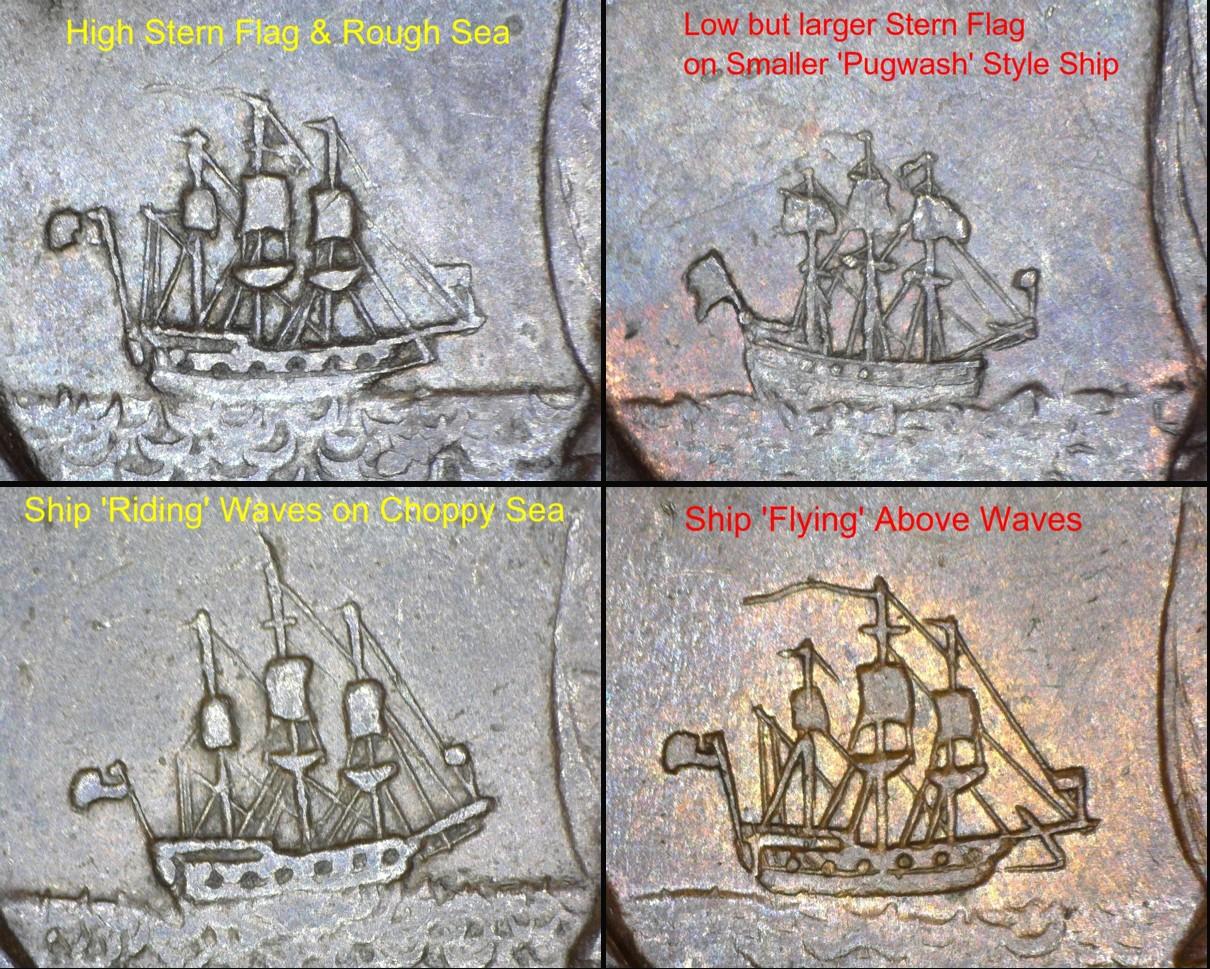 alfnail Posted April 1, 2020 Posted April 1, 2020 (edited) I was reminded earlier this week by a member of the forum of an exercise I did some years ago regarding the 1797 George III currency penny. I thought I would add some of those findings to the forum as some other members may also find of interest. Over the years I amassed quite a number of pieces so that I may check the variations in the ship design on the reverse. On Page 306 of Peck, with reference to the reverse paired with the 10 leaf obverse he says:- “Ship with 6 incuse gunports, and an ensign at the stern, but there are numerous variations in the design of the ship, the arrangement of the rigging, and the rendering of the sea. The waves are usually not crested with foam”. Then on Page 307, reference the reverse paired with the 11 leaf obverse he says …….“the varieties of the ship are less numerous” Once I owned a digital microscope I was able to examine these variations in more detail, and take pictures of the ship and waves on each of my pieces to the same scale. As a result I was able to log 40 different varieties of ship design on 1797 pennies which have the 10 leaf obverse, and a further 7 different ships on the 11 leaf obverse variety. No doubt there are a few additional ship designs which I did not have in my collection. My findings definitely seem to confirm what Peck documented, and I thought it may be of interest to some if I showed some of the more obvious differences in these ship and wave designs. I have scaled these pictures down to meet the 500Kb limit on forum postings, but if anyone wants full size then please PM me. I guess the die makers had some fun with this! Edited April 1, 2020 by alfnail 1 Quote