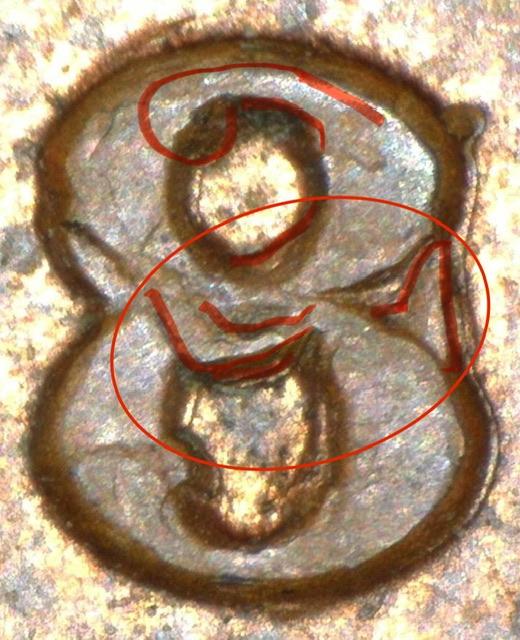 Coinery Posted January 19, 2024 Posted January 19, 2024 Interestingly there’s an image on the other thread that makes me see a three for the first time, and a clear rear serif of a four! Here’s a proposal…what about an original three, with a four inserted the following year, BUT it broke up during the insertion (bits in the red circle), making the die irreparable/useless until the next useable digit came along to cover up the mess, which could only be an eight or a nine? Quote